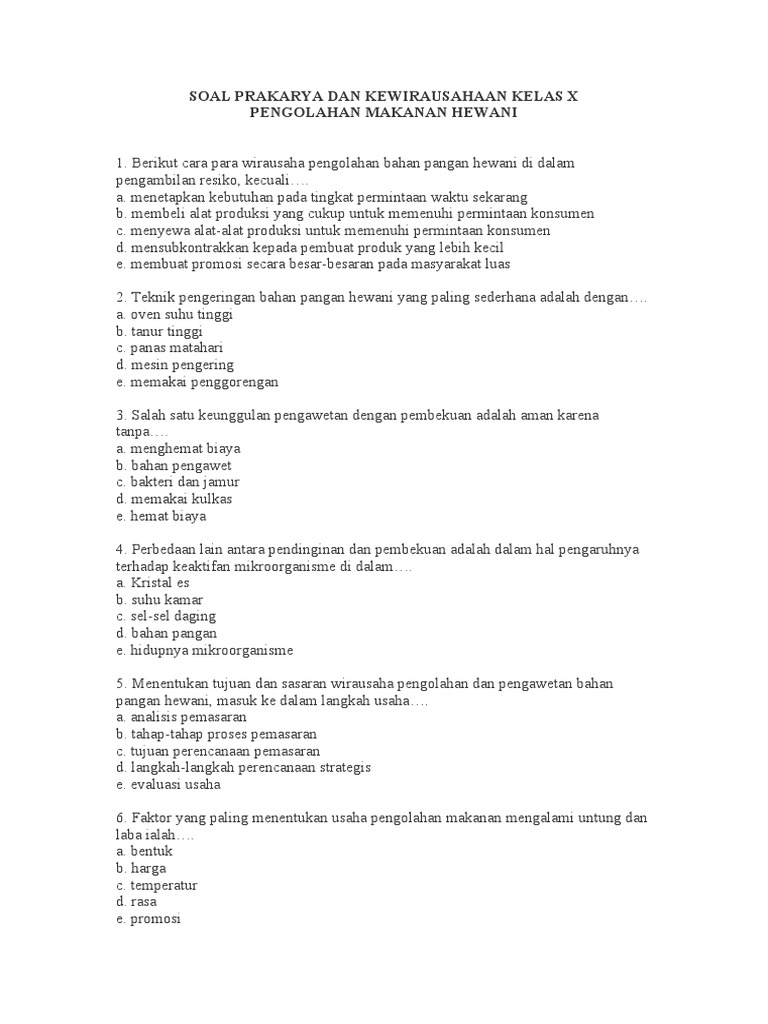 Prakarya dan Kewirausahaan merupakan mata pelajaran yang membekali siswa dengan pemahaman mendalam tentang dunia usaha, mulai dari ide kreatif hingga implementasi bisnis yang sukses. Di semester pertama kelas X, fokus utama seringkali diarahkan pada konsep dasar kewirausahaan, identifikasi peluang, perencanaan bisnis sederhana, serta pentingnya inovasi dan kreativitas. Untuk membantu siswa menguasai materi ini, latihan soal yang relevan dan komprehensif menjadi sangat krusial. Artikel ini akan menyajikan berbagai contoh soal Prakarya dan Kewirausahaan Kelas X Semester 1, dilengkapi dengan penjelasan singkat untuk setiap tipe soal, sehingga dapat menjadi panduan belajar yang efektif.